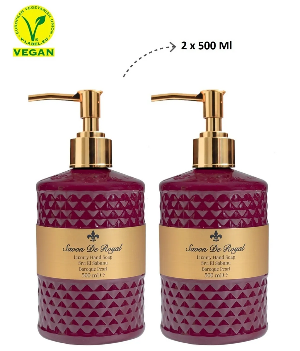 Savon De Royal Luxury Vegan Liquid Soap Baroque Pearl is your go-to vegan hygiene solution with 2 x 500 ml of dense liquid soap. Packaged in a stylish baroque-inspired bottle, this soap provides rich, luxurious lather that carries the unique scent of pearls throughout your bathroom.